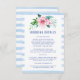 Tropical floral wedding design. Tropical flowers and leaves forming a beautiful bouquet. Bright and saturated watercolor artwork. Bold and modern blue lettering. Light blue watercolor stripes. Pink, green, blue. Perfect for summer wedding, Hawaiian wedding, beach wedding, floral colourful wedding.
