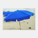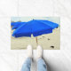 This door mat features blue beach umbrellas and seagulls in the sand.