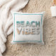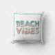 Beach Vibes in very bold, all capital letters with a sandy ocean scene inside the letters. Slight drop shadow on the words. Because of the drop shadow, the front design only works on a white pillow. The back side colour can easily be changed.