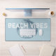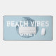 beach cottage theme desk mat with customisable "beach vibes only" text in distressed white font, blue background and vintage blue tinted seashell illustration