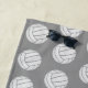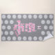 This volleyball themed beach towel features the mixed typographic phrase, "The beach volleyball court is my happy place" in pink and white and custom player monogram on a medium grey background with surrounding small white volleyballs pattern - by katz_d_zynes