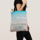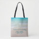 Tote bag to use for a beach wedding welcome to guests. A beach scene, with tropical blue ocean water and light tan sand, covers this quality tote bag. Customise with text near the bottom, on one side only. Include names, location of wedding and date. Makes a nice, useable gift for members of the wedding party as well.