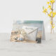An ivory wedding envelope is adorned with a sprig of baby's breath and rests on sandy beach terrain, accompanied by a sand dollar and a starfish