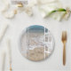 Open window with curtains overlooking newlyweds' names in beach hearts and sand with frothy ocean surf for wedding reception.