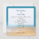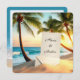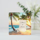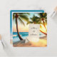 A blank invitation paper with an envelope rests on a sandy beach against the backdrop of gently swaying palm trees and a serene ocean under a vibrant sunset for a beach wedding invite.