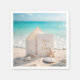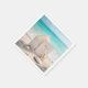 A blank card and envelope rest on a sandy beach surrounded by seashells, a starfish, and a turquoise ocean background.