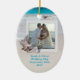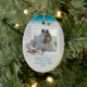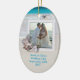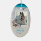 Keepsake wedding ornament with a beach theme. Add a picture to this oval, ceramic ornament and customise with text on both sides. Tropical seashells decorate the frame and background image is ocean water and beach sand. Place names, wedding date on the front and destination location on the back.