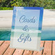 A beautiful ocean waves photo decorates this modern destination wedding cards and gifts pedestal sign. Pretty blue cursive script over the tropical seaside photograph for your beach wedding sign.