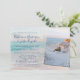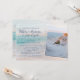Turquoise blue, blush pink, peach and yellow sandy beach sunset or sunrise photo wedding invitation with elegant modern script typography and an overlayed geometric rectangle frame border. Upload your engagement photo or favourite beach picture on the front right side of the horizontal landscape orientated invitation.