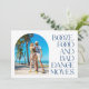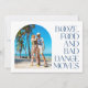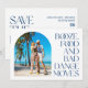 Stylish modern arch photo save the dates for the fun-loving couple who can't wait to celebrate at their beach wedding. Blue text design with that reads: Booze, food and bad dance moves. Customise with your photo on the front and your wedding details on the backside of the card. Can be used for any beach or tropical location.
