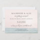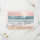 Beach wedding save the date card with a heart aeroplane monogram flying over a blush pink sunset on a sand beach with ocean waves and simple, modern typography, for a destination wedding or wedding that guests will be travelling to meet you at your favourite vacation destination. The back features a smooth sand beach and muted slate blue waves closeup. Replace the photo on either side with your own favourite destination photo for a fully personalised design.