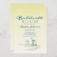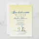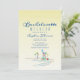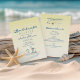 Simple, modern beach weekend Bachelorette itinerary invitation with custom schedule at the back and colourful tropical beach illustrations, simple blue calligraphy script on sunny yellow background.