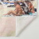 The brightly coloured beachscape on this Wall Tapestry is an original photograph by ZoeSPEAK of a beach in Key West, Florida. The sky is deep blue with puffy white clouds. The sun is shining on the warm yellow sand and a pier extends along the horizon of the blue waters of the ocean. A lone coconut palm tree stands at the edge of the water, offering little shade for the people sitting along the beach.