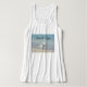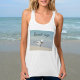 Beach Yoga tank top with a Royal Tern seabird posing on a sandy beach along the seashore. This beachy tank top is cute, chic and playful fun.