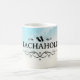 Beach lovers coffee mug features watercolor beach and the word "beachaholic" with accent elements, flip flops icon