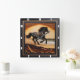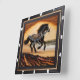 Experience the thrill of the open beach with our stunning wall clock, featuring a majestic Morgan horse racing along a golden shoreline at sunset. This exquisite timepiece is framed by a sleek ½-inch flat black wooden border, which beautifully contrasts with the intricate, charred wood design that showcases deep carvings and rugged burn marks in shades of red, grey, and black. The textured grain adds a touch of rustic elegance, making it a perfect addition to any coastal or equestrian-themed decor.