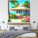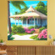A beach house with ocean view colourful tropical flowers, palm trees, and a yellow cat asleep on the porch.