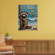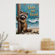 This charming painting features a racoon with detailed brown and white fur, clinging to a weathered wooden post on a sandy beach. The ocean waves crash gently in the background under a bright, partly cloudy sky. The text "Cute but feral" is written in a stylised yellow font above the racoon. The artwork has thick, textured brushstrokes, giving it a whimsical and slightly windswept feel.