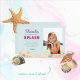 Celebrate your little mermaid with this illustrated kids' birthday party thank you card featuring a hand-drawn mermaid and beach scene. This invitation has a customizable back side which includes a section for party details and a photo of the birthday child. Variations in mermaid's physical features available!