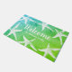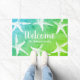Beachy doormat featuring white starfish, white script "welcome" text, ocean green/blue gradient background, and your family's name in white script!