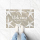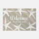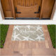 Beachy doormat featuring white starfish, white script "welcome" text, sand dunes background, and your family's name in white script!