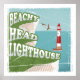 A retro poster style illustration of Beachy Head Lighthouse. A red and white striped lighthouse in the English Channel off the cliffs of Sussex. A design for anyone who loves lighthouses. The lighthouse is viewed from the top of the white cliffs. The words beachy head lighthouse are written in the grass on the cliff tops.