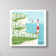 A retro poster style illustration of Beachy Head Lighthouse. A red and white striped lighthouse in the English Channel off the cliffs of Sussex. A design for anyone who loves lighthouses. The lighthouse is viewed from the top of the white cliffs. The words beachy head lighthouse are written in the grass on the cliff tops.