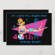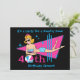 Fun retro 40th birthday invitations featuring a beach babe wearing sunglasses, a blue polka dotted bikini and a pink tiara. A big pink white and blue beach ball is the zero in the word 40th. Customisable text. Perfect for your favourite beach babe on this milestone birthday. Also available T-shirts, tote bags, caps, mugs, postage stamps and more! PinkInkArt original!