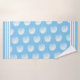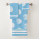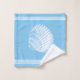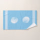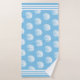 Pretty white stripes and white scalloped seashells patterned bath towels with a bright ocean blue background.