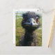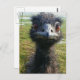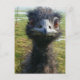 Full colour photographic image of an EMU, or large ostrich-like bird, with details showing feathers and plumage, and its beady brown eyes intently focused on its prey - the photographer!