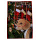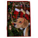 Beagle dog poses and resists temptation in front of all the dog toy looking Christmas decorations dog lovers Christmas holiday gift bag
