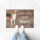 Funny beware of the wet kisser" Beagle Dog door mat set on a rustic faux background. Visit our shop to view a large assortment of dog breads