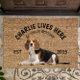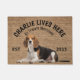 Beagle Personalised Dog lover welcome doormat. This welcome mat can be personalised with your dog’s name, the slogan can also be changed or you could use a picture of your own dog (make sure it's transparent). Text reads: Charlie lives here…. All treats welcome