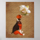 Cute beagle puppy smelling a delicate white rose on textured look aged paper poster print .