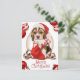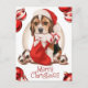 Cute beagle puppy with christmas stocking, Santa hat, and christmas ornements, painted by artist Maryline Cazenave.
