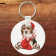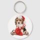 Cute beagle puppy with christmas stocking, Santa hat, and christmas ornements, painted by artist Maryline Cazenave.