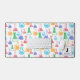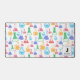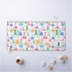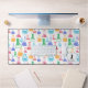 Desk mat with a fun and colourful pattern. Research scientist vibe with beakers and flasks of different shapes and sizes in bright happy colours.