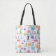 Tote bag with a fun and colourful pattern. Research scientist vibe with beakers and flasks of different shapes and sizes in bright happy colours.
