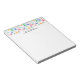 Notepad with a fun and colourful pattern. Research scientist vibe with beakers and flasks of different shapes and sizes in bright happy colours.