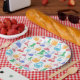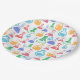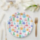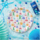 Paper plates with a fun and colourful pattern. Research scientist vibe with beakers and flasks of different shapes and sizes in bright happy colours.