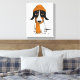 Cartoon style drawing of a black, tan and white Piebald Dachshund wearing an orange beanie and scarf. A fun canvas print for anyone who loves wiener dogs. Visit Jenn's Doodle World for even more cute animal art and dog lover's illustrations.