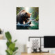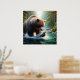 A painting showcasing a bear and a fish gracefully intertwined in a river. The bear is reaching out towards the fish as it elegantly swims against the current, creating a harmonious and captivating scene.