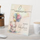 A cute, cuddly teddy bear, a bunch of balloons, butterflies, fluffy clouds and your details along with the word "Welcome" at the top are featured on this pedestal sign. CHANGE THE SIZE and MATCHING items in our collection.