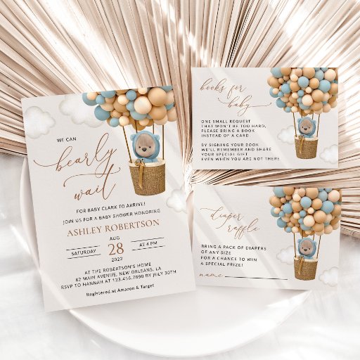 Invite friends and family in style and set the tone for your special day with this charming baby shower invitation. Design features baby bear with blue balloons on beige background.