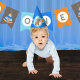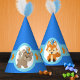 Woodland Forest Birthday Party Hats in Blue, Orange and Brown. Features an adorable bear and bunny on front and a simply sweet tribal inspired pattern going around. Part of our "Wild One" 1st Birthday Collection.