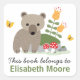 Cute and fun bookplate stickers / book labels for kids featuring a little cartoon bear cub standing next to a rock with flowers in the background. In the foreground are red and white toadstool mushrooms and around the little bear flutters yellow butterflies. Customisable text "this book belongs to". Personalise the name. Cute design for children, ideal for labelling school books and other books.