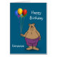 A fun card for a child's birthday. The design features a cartoonish brown bear wearing purple pants and holding colourful birthday balloons. All text (front and inside) is easily changed as desired by using the template. For additional changes (different type font, colour, size or placement) select "Personalise this template" then select "Customise design with Design Editor." The background colour on the front can also be changed by using the Design Editor. Select "Background" (on the left side) and choose a colour. For additional colour options, check the plus sign and work with the design options available. Message me if you need help and I will attempt to provide directions.