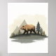This illustration depicts a brown bear walking along a ridge with mountains in the background and stylised trees. The gentle colours and simple shapes evoke a sense of peace and tranquillity in nature.