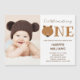 Our little bear is turning one first baby birthday magnetic invitation with a photo template. This invitation is brown and white with the word "One" in large letters with a bear face illustration as the first letter of the word. Simply, customise this invitation with your photo & information, add it to your cart, and happy birthday to your wonderful baby!