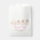 This cute and whimsical thank you favour bag features a watercolor train in pastel pink, yellow and brown with adorable baby bears. The text combines handwritten script and serif fonts for a stylish and modern look. This is perfect for a bear or train themed baby shower.